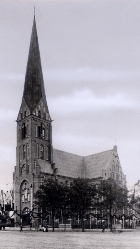 Im Jahre 1909 wurde am Schröderplatz die erste Christuskirche geweiht. Die größte katholische Kirche Mecklenburgs war ein prachtvoller neogotischer Klinkerbau, entworfen vom Geheimen Baurat Ludwig Möckel.
